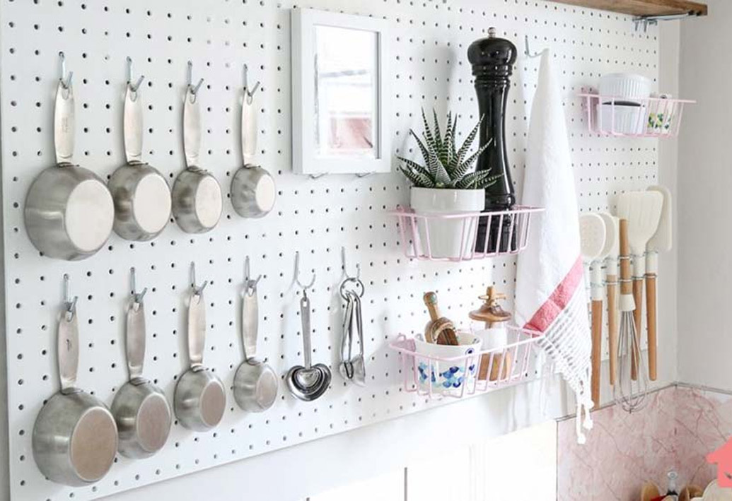 As paredes também podem ter funcionalidade! Utilize um painel do tipo pegboard (perfurada) ou barras com ganchos. Isso valoriza muito o espaço e facilita para guardar os itens.