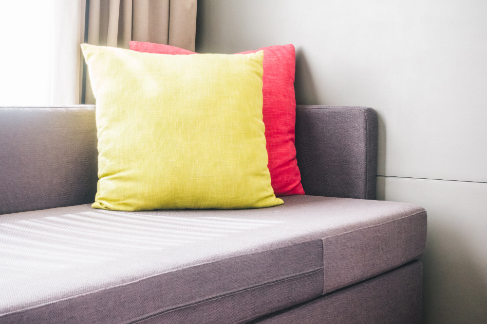 Experimente usar tecidos para encapar almofadas antigas, como o veludo ou o linho. O custo é baixo e o impacto visual é surpreendente!